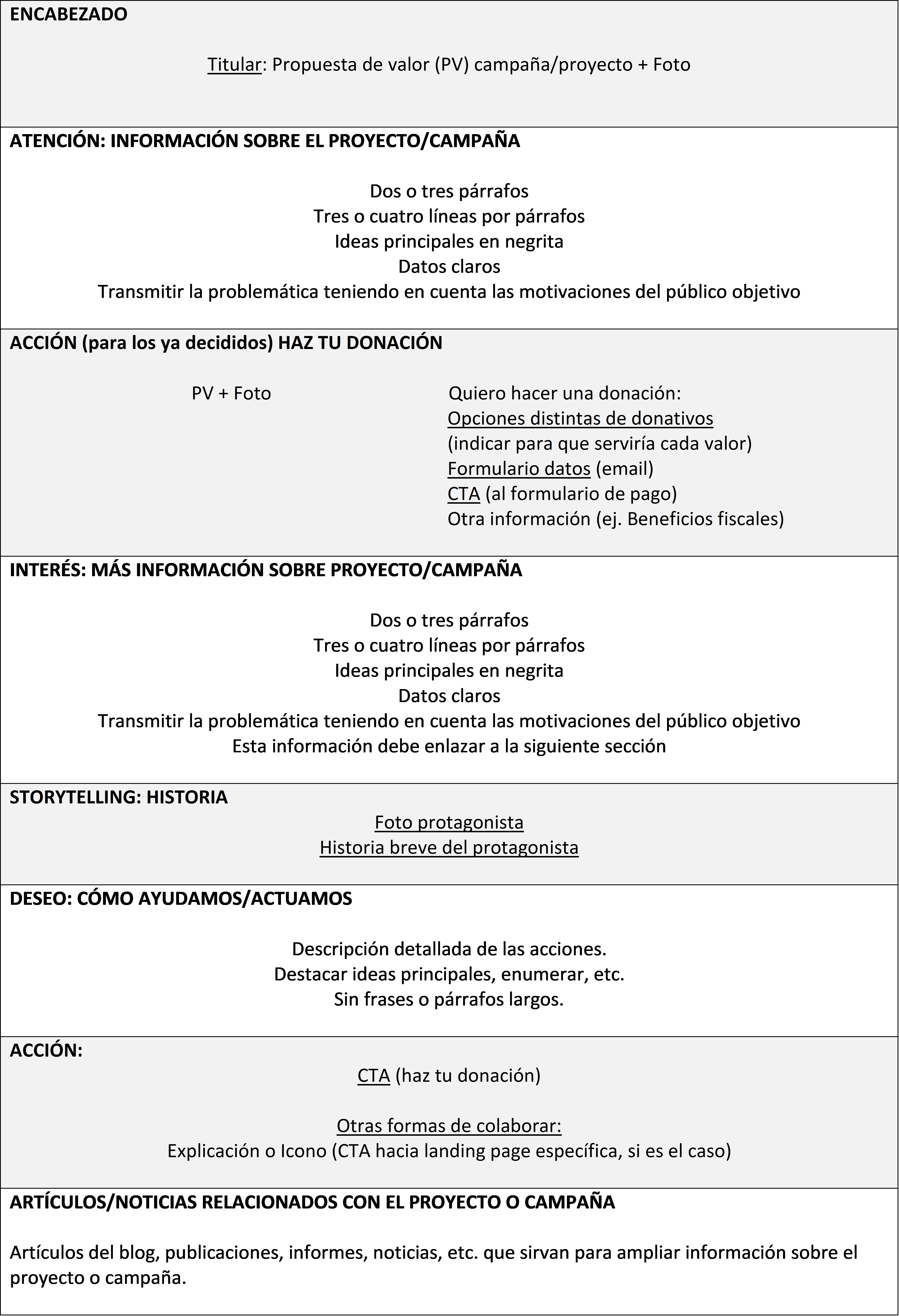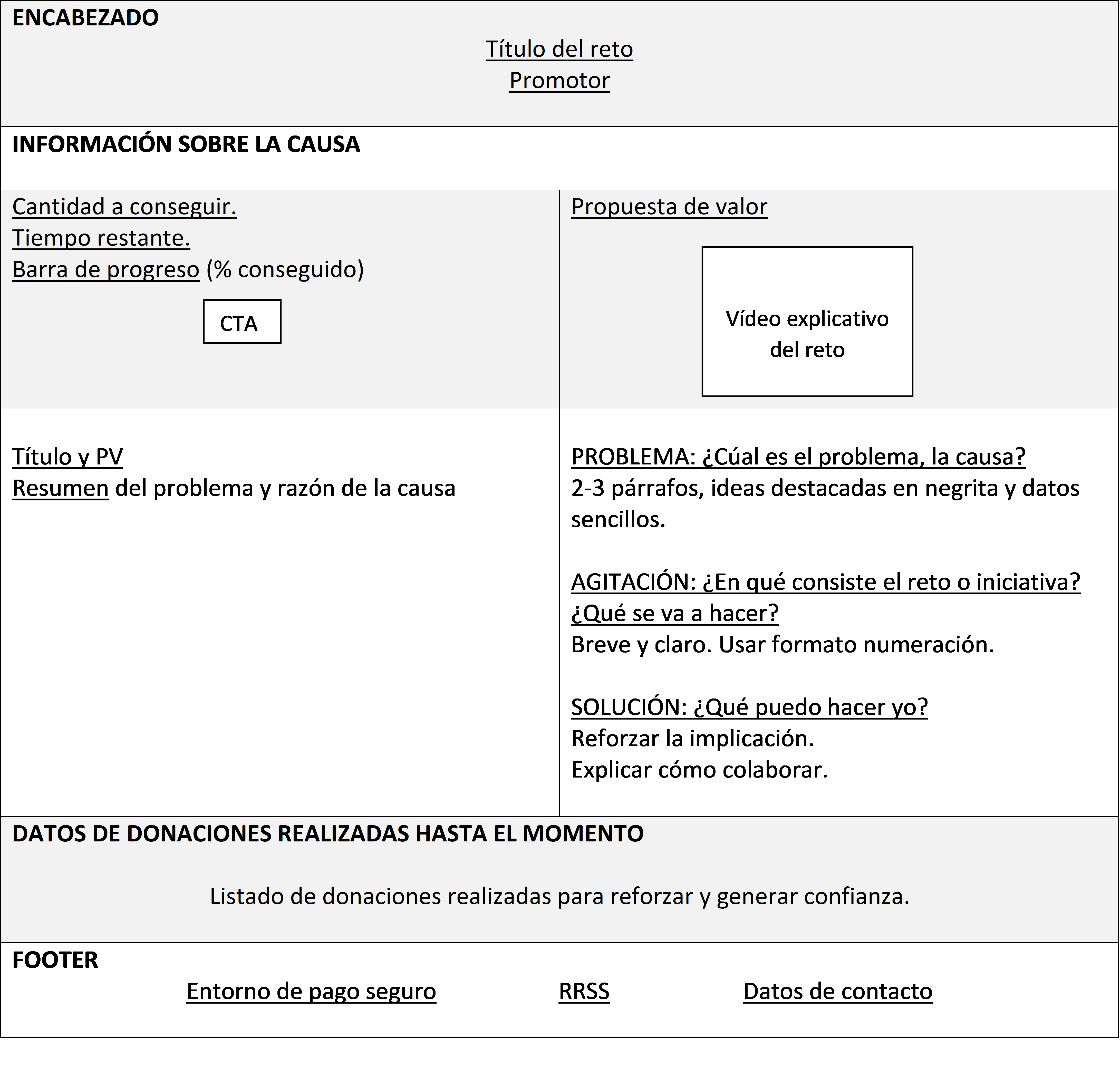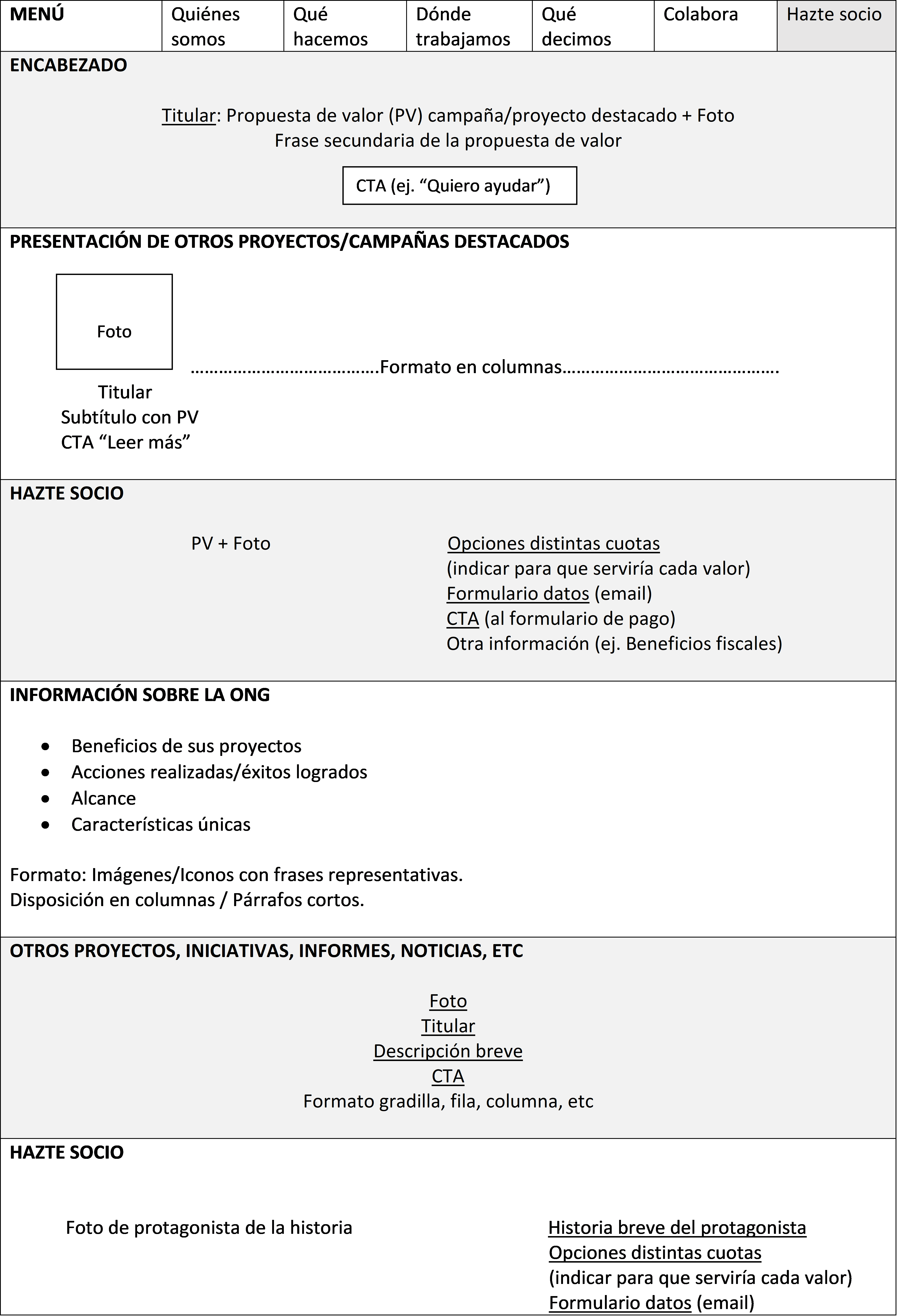 Y ahora, para ayudarte a situar mejor todos estos consejos dentro de la web, te quiero dejar unas plantillas de ejemplo de la estructura que pueden seguir distintas páginas de tu web (Inicio, proyecto, haz tu donativo/socio y reto/crowdfunding).